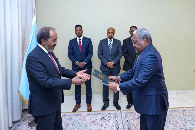 Mogadishu (HOL) - Somali President Hassan Sheikh Mohamud received the diplomatic credentials of the Kenyan Ambassador to Somalia, Cyprian Kubai Iringo, at the Presidential Palace in Mogadishu on Sunday.
