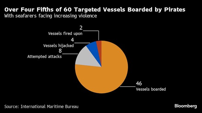 Acts of piracy off Somalia first seriously blighted the industry in 2008 and peaked three years later. The use of armed guards, improved on-board practices, and an increased naval presence all helped to quell the attacks.The IMB report didn’t say why there’s been a revival this year. However, the incidents resumed in December, not long after Houthi militants began blowing up commercial vessels nearby. The rebels’ campaign drew the attention of naval protection forces trying to protect the ships.