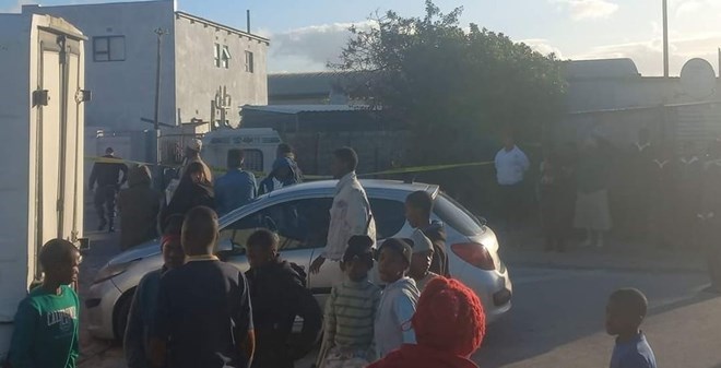 Onlookers gather at the crime scene in Philippi, Cape Town, where Somali businessman Omar Abdullahi Ahmed, also known as Omar Qamarji, was fatally shot by armed robbers. Police have cordoned off the area as investigations continue. The incident marks another tragic event in the ongoing pattern of xenophobic violence against Somali immigrants in South Africa.