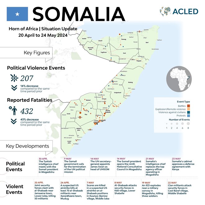 From April 20 to May 24, over 207 incidents of political violence resulted in 432 deaths, according to the Armed Conflict Location & Event Data Project (ACLED). The Lower Shabelle region experienced the most concentrated violence, while the Mudug and Middle Juba regions reported the highest number of fatalities, with 105 and 70 deaths, respectively.