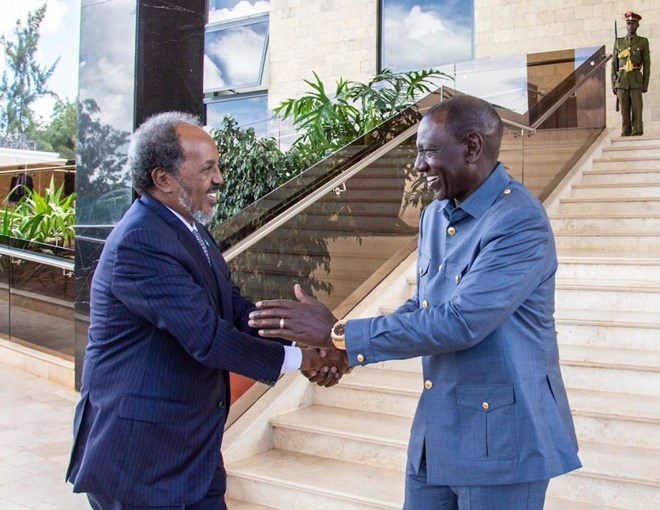 Somalian President Hassan Sheikh Mohamud pictured with Kenyan President William Ruto in the State House in Nairobi, Kenya, on April 11th, 2024 (Photo from PCS).