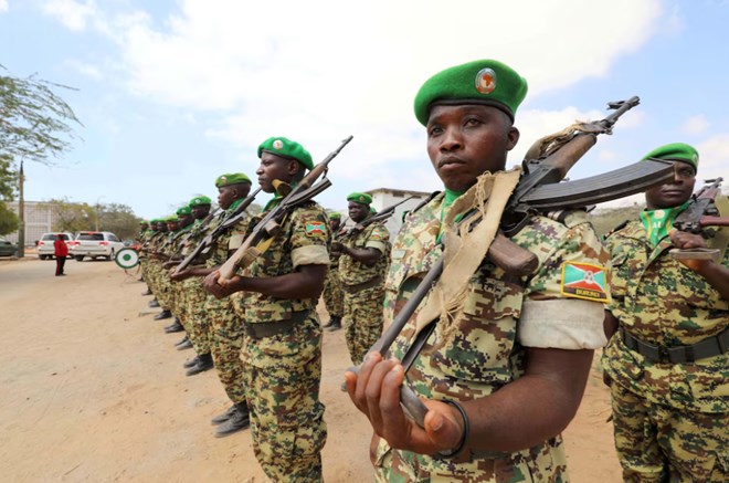 Burundian African Union Mission in Somalia (AMISOM) peacekeepers stand in formation during a ceremony as they prepare to leave the Jaale Siad Military academy after being replaced by the Somali military in Mogadishu, Somalia. February 28, 2019. REUTERS/Feisal Omar/File Photo Purchase Licensing Rights