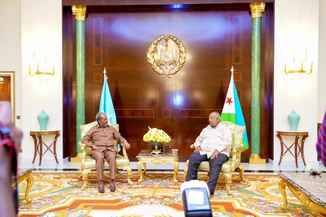 Djiboutian President Ismail Omar Guelleh discussed with his Somalian counterpart Hassan Sheikh Mohamud aspects of strengthening bilateral relations and cooperation between the two countries across all fields, especially security and economy.