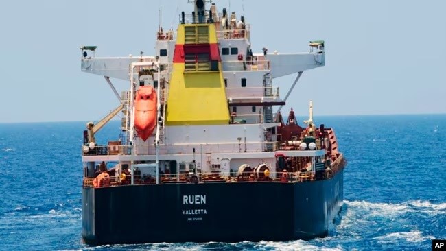 FILE - This photograph shared by the Indian navy on the X platform shows the hijacked ship MV Ruen on March 16, 2024. The Indian navy rescued 19 crew members from the ship, then, on March 29, intercepted a fishing vessel in the Arabian Sea after a suspected hijacking.