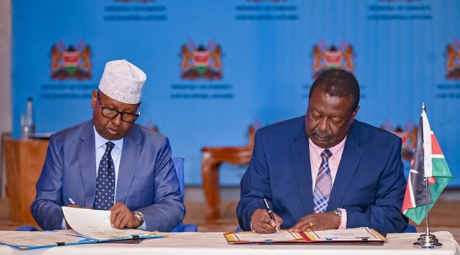 Prime Cabinet Secretary Musalia Mudavadi with Somalia’s Minister for Foreign Affairs and International Cooperation Ahmed Moalin Fiqi during the signing of key MoUs at the closure of the 3rd Session of the Kenya - Somalia Joint Commission for Cooperation (JCC) at a  Nairobi Hotel on May 6, 2024.