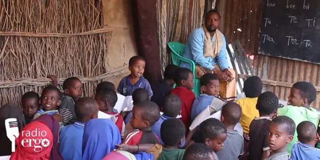 Children attend an overcrowded makeshift classroom in Mogadishu's displacement camp, highlighting the urgent educational crisis faced by displaced families in the region. Credit: Radio Ergo.