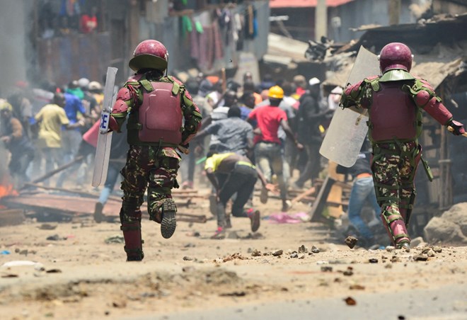 Riot police officers disperse supporters of Kenya's opposition Azimio La Umoja (Declaration of Unity) One Kenya Alliance, during nationwide protests over the cost of living and alleged fraud during the 2022 elections, in Mathare settlement of Nairobi, March 27, 2023.