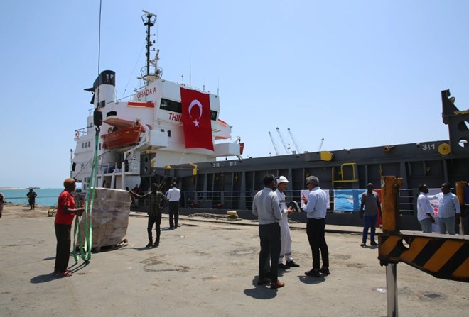 The “Goodness Ship” carrying 3 thousand tons of humanitarian aid materials sent by the Disaster and Emergency Management Presidency (AFAD) to the Somali people struggling with hunger has arrived in Somalia's capital Mogadishu. (AA Photo)
