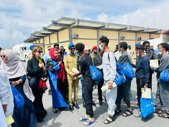 Somali officials and representatives from the International Organization for Migration (IOM) welcome a group of Somali returnees at Mogadishu's Aden Adde International Airport. The 164 returnees had been stranded in Libya and were successfully repatriated as part of Somalia's ongoing efforts to assist its citizens trapped in conflict zones and dangerous migration routes.