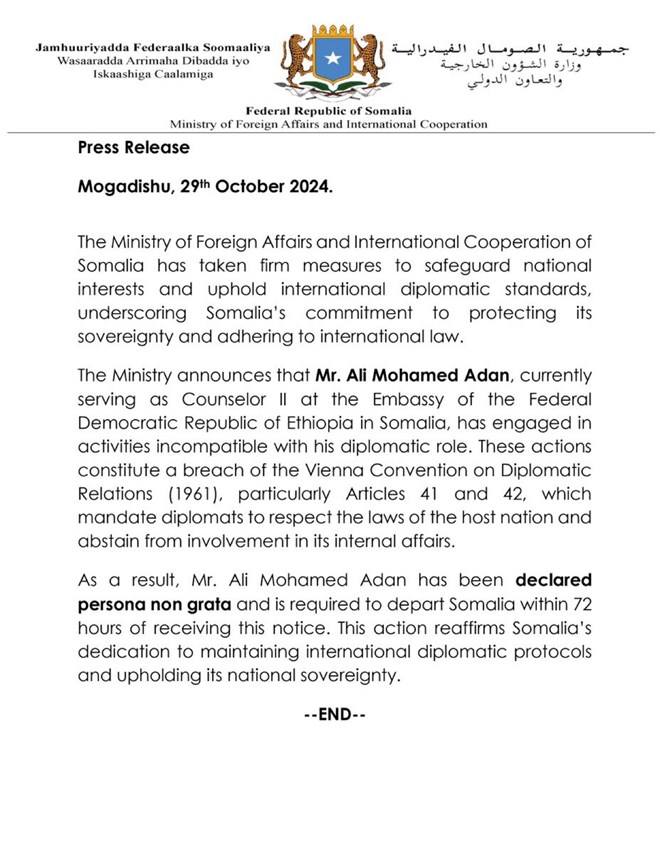 The Ministry of Foreign Affairs accused Adan of “engaging in activities incompatible with his diplomatic role.” The press release referenced the Vienna Convention on Diplomatic Relations (1961), highlighting Articles 41 and 42, which “mandate diplomats to respect the laws of the host nation and abstain from involvement in its internal affairs.” The Ministry stated this decision underscores Somalia’s commitment to “protecting its sovereignty and adhering to international law.”