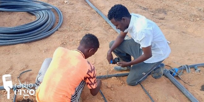 Abdifatah working on installing irrigation pipes at the farm where he is employed / Mohamed Abdulqadir Da'ar / Ergo