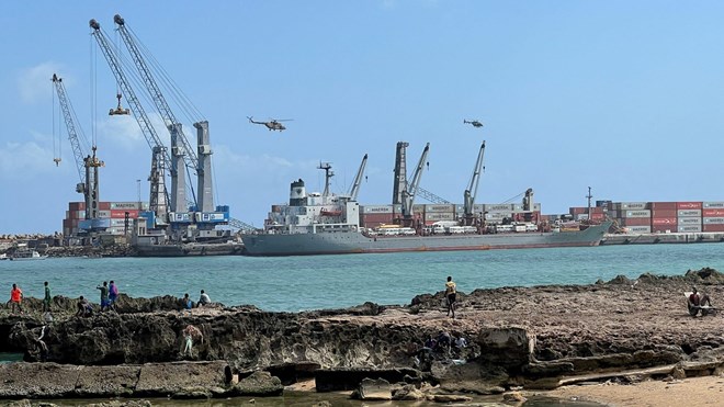 Security helicopters hover above the Mogadishu Sea Port after an Egyptian warship docked to deliver a second major cache of weaponry in Mogadishu, Somalia on September 23, 2024. PHOTO | REUTERS