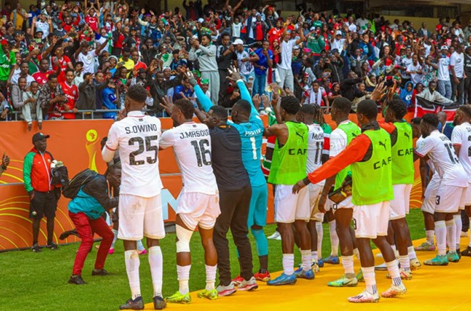 Harambee Stars players celebrate their win over Zambia with the fans at Kasarani stadium.