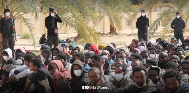 Libyan authorities guard rescued African migrants, including those from Somalia, Eritrea, and Ethiopia, after freeing them from human traffickers in Ajkhara. Many showed signs of severe malnutrition and physical abuse. CREDIT/ LYWitness