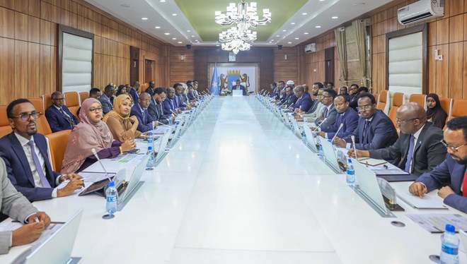 Members of Somalia’s Council of Ministers attend their weekly cabinet meeting in Mogadishu, chaired by Prime Minister Hamza Abdi Barre. The latest session approved the formation of a 15-member National Higher Education Committee.