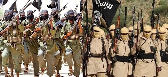 FILE — A composite image showing fighters from Somalia’s Al-Shabaab (left) and the Islamic State group’s Somalia faction (right). Puntland authorities cite the combat training and operational capabilities of captured militants from both groups as justification for holding them in high-security prisons rather than rehabilitation centers.