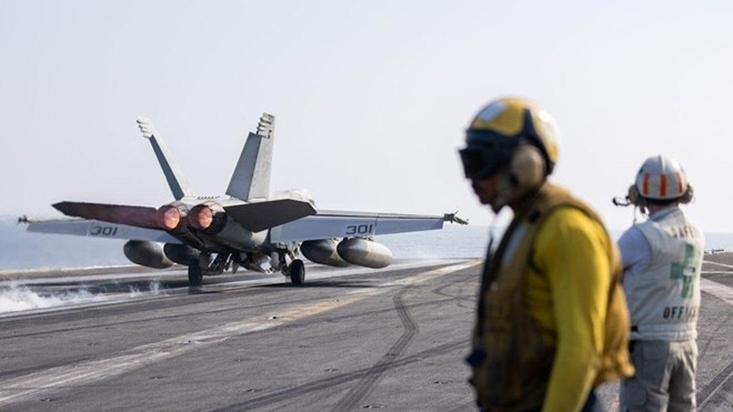 A U.S. Navy fighter jet takes off from an aircraft carrier's deck CREDIT: US Africa Command