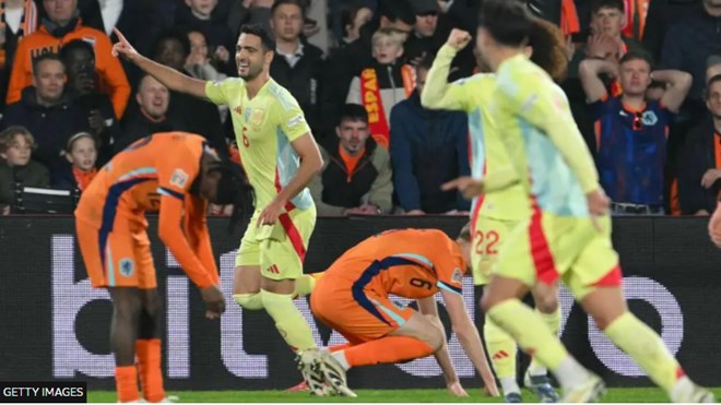 Arsenal's Mikel Merino scored a stoppage-time equaliser to earn Spain a draw against the Netherlands in their Nations League quarter-final first leg.