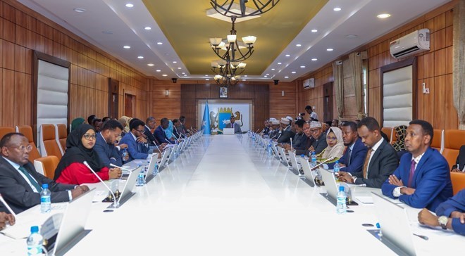 Members of Somalia’s Council of Ministers attend a cabinet meeting in Mogadishu, Somalia, on May 15, 2025. The session, chaired by Prime Minister Hamza Abdi Barre, approved a new security cooperation agreement between Somalia and Saudi Arabia aimed at boosting military coordination and counterterrorism efforts.