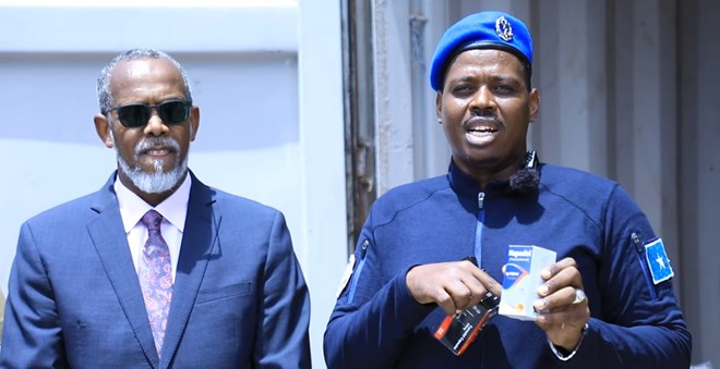 Police spokesperson Abdifatah Adan Hassan (right) displays confiscated pharmaceutical tablets as Mogadishu Port Director Mohamed Ali Nur ‘Ameriko’ (left) looks on during a press briefing at Mogadishu’s main seaport on Thursday. Somali authorities showcased the seized shipment, which police said contained narcotics disguised as medical supplies intended for sale in local markets. Courtesy - Somali Police