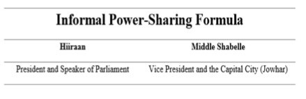 Hirshabelle power-sharing arrangements have failed in several regards. From the onset there was no acceptance of the political settlement, and the mechanisms by which the settlement was attained were illegitimate. The administration supported a failed power sharing formula, a face-saving mechanism to evade a worse consequence, however, astoundingly, this was devoid of any involvement of representatives of the Hiiraan region. The subsequent unwritten power sharing formula was implemented: