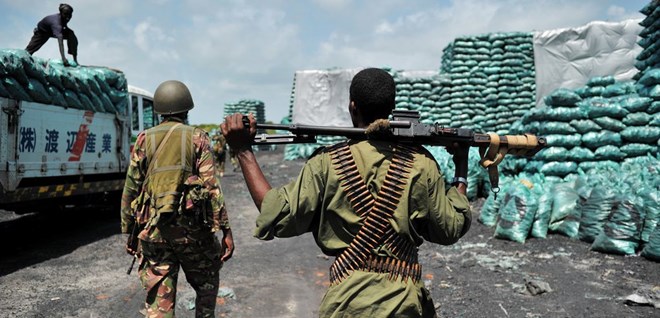 Militia allied with the Federal Government of Somalia and Kenyan Defence force soldiers walk through a charcoal loading area in Burgabo, Southern Somalia on December 14, 2011. Burgabo is a Somalian port village which has been secured by Kenyan forces as they advance further up the Somali coastline in search of Al-Shabaab fighters. AFP PHOTO/Carl de Souza (Photo credit should read CARL DE SOUZA/AFP/Getty Images)
