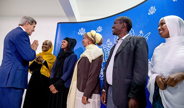 Then-Secretary of State John Kerry meets with Somali civic leaders at the airport in Mogadishu, Somalia, Tuesday, May 5, 2015. Reuters