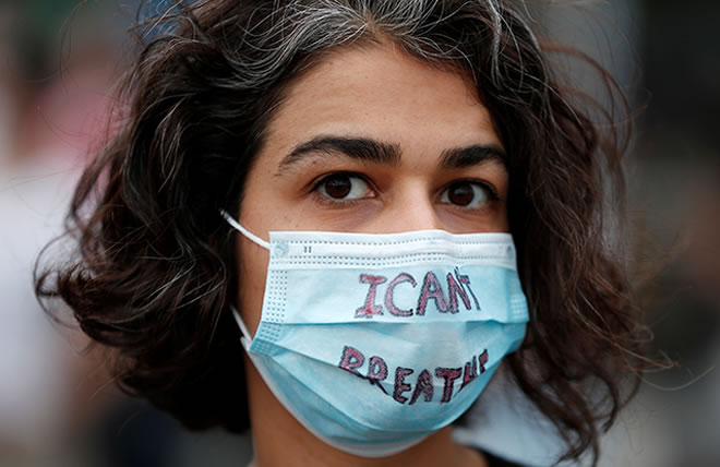A protester wearing a face mask with the words "I can't breathe" at a May 26 gathering near where George Floyd was killed. REUTERS/Eric Miller