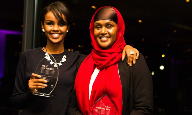Ilwad Elman and her mother, Fartuun Adan, accept an Oxfam Right the Wrong award -