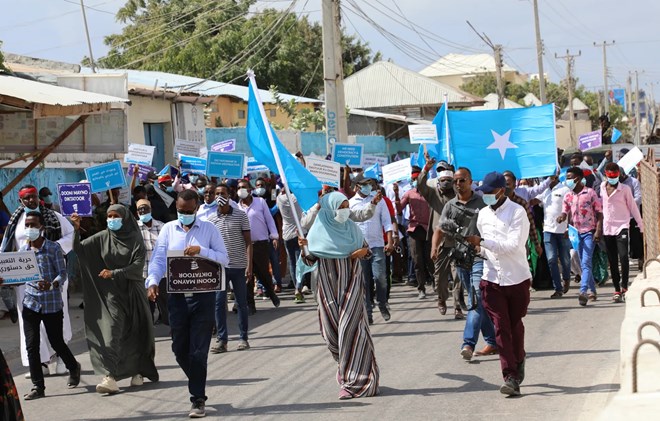 FILE - Somalis march and protest against the government and the delay of the country's election in the capital, Mogadishu, Somalia, February 19, 2021.