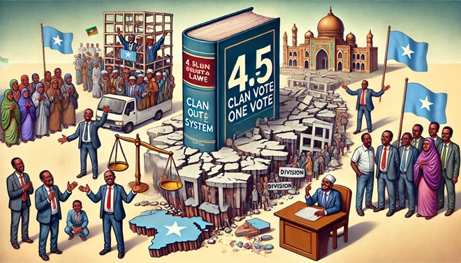 Hindisaha Xeerka Doorashada Q&C oo ka kooban 9 cutub iyo 79 qodob wuxuu ka soo horjeeda dastuurka JFS, Nidaamka federaalka, mabaadi’ida doorashada Q&C, higsiga Midnimada, iyo Sinnaanta muwaadiniinta Soomaaliyeed. Xeerku wuxuu sharciyeynaya, dhidibada u aasaya doorashada ku dhisan qoondada beelaha 4.5. Waa xeer lagula dagaalamayo matalaadda muwaadiniinta, xaqa codbixiyayaasha, iyo horumarka dowladnimada Soomaaliya. Sidaa awgeed, Xeerku uma qalmo Ummadda Soomaaliyeed, waana lagama maarmaan in dib loogu noqdo.
