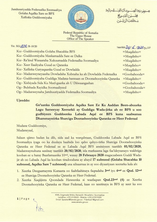 Arbaco, Juun 24, 2020 (HOL) - Guddoomiyaha aqalka sare ee barlamaanka Soomaaliya ayaa sheegay in la marin habaabiyay oo wax ka bedel lagu sameeyay afar xeer oo ku saabsanaa dhameystirka sharciyadda doorashooyinka Soomaaliya.