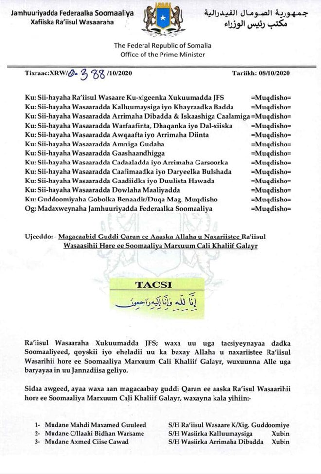 newsinsideGuddigaan oo ka kooban 13 xubnood ayaa loo xilsaaray inay diyaariyaan aaska qaran ee raysal wasaarihii hore Cali Khaliif, iyadoo aaskiisa loo maamuusidoono si ka duwan aasaskii qaran ee loo sameeyay madaxdii hore maadaama marxuumku u geeriyooday Covid19.