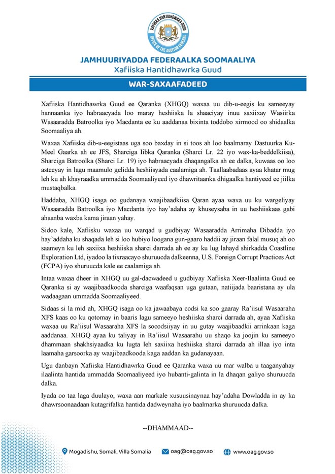 Axad, Febraayo, 20, 2022 (HOL) - Xafiiska Hantidhawrka guud ee dowladda Soomaaliya, ayaa war kasoo saaray heshiiskii wasaaradda Batroolka iyo Macdanta ay la gashay shirkadda Coastline Exploration Ltd.