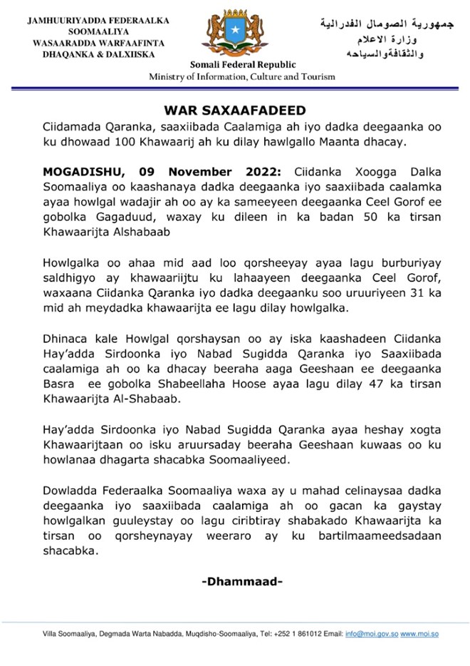 Arbaco, November, 9, 2022 (HOL) - Dowladda Soomaaliya ayaa sheegtay in ciidamada xoogga dalka oo taageero ka helaya saaxiibada caalamka ay dileen 50 kamid ah dagaalamayaasha, kaddib howlgal ka dhacay deegaanka Ceel Gorof ee gobolka Galgaduud.