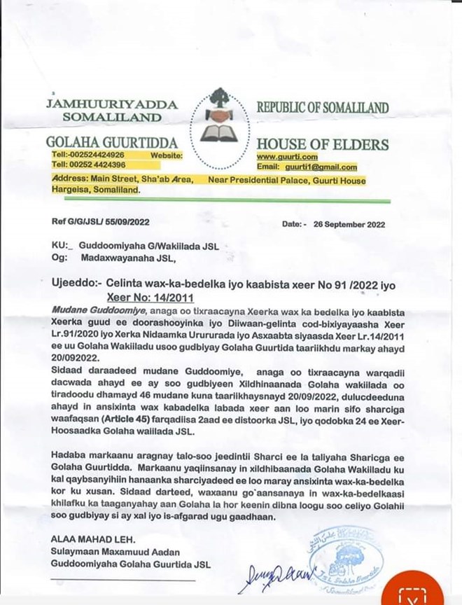 Isniin, September, 26, 2022 (HOL) - Golaha Guurtida Somaliland ayaa dib golaha wakiilada ugu celiyay xeerka guud ee doorashooyinka Xeer Lr 91/2022 iyo xeerka nidaamka urrurada iyo axsaabta siyaasada ee Xeer Lr 14/2011.