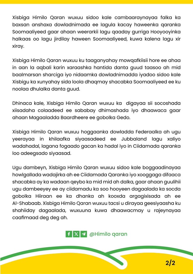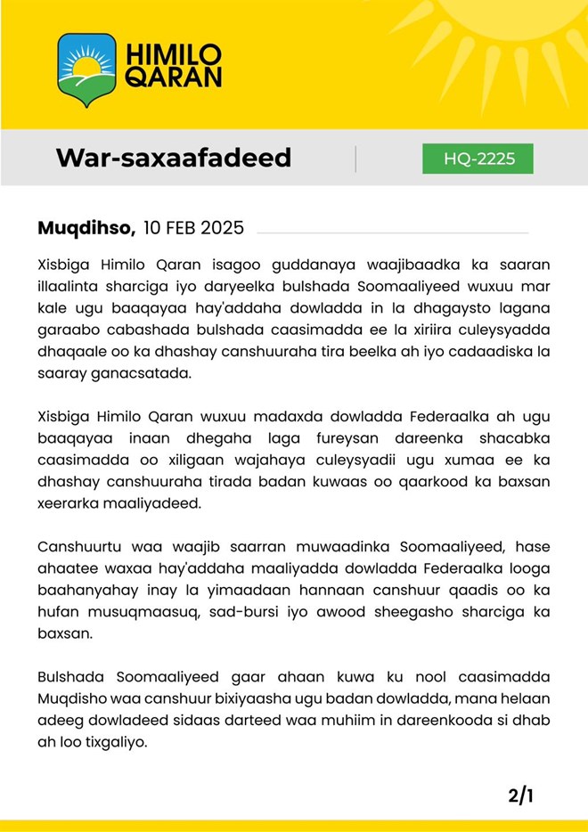 "Dowladda Federaalka waxaa looga baahan yahay iney la imaato hanaan canshuur qaadis oo ka hufan musuqmaasuq, sad-bursi iyo awood sheegasho sharciga ka baxsan" ayaa lagu yiri warsaxafadeedka kasoo baxay Himilo Qaran.