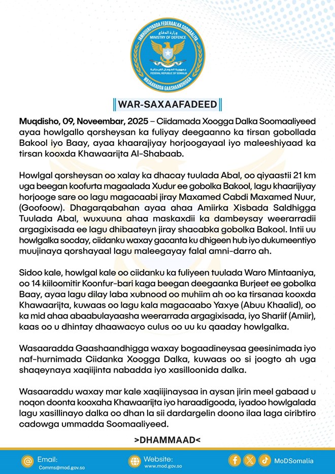 Axad, November 9, 2025 (HOL) - Ciidamada dowlada Fedaraalka Soomaaliya ayaa howlgalo qorsheysan oo lagu dilay horjoogayaal iyo maleeshiyaad ka tirsan Al-shabaab ka fuliyay deegaano ka tirsan gobolada Bakool iyo Baay.