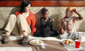 Deana Ribar, with Catholic Charities, talks Saturday with Fatuma Abdi, 7, and Asha Salim, 6, both of Lawrenceville, at Khalil's restaurant in Bloomfield. The restaurant hosts people from the Somali-Bantu community each year for a holiday celebration. |