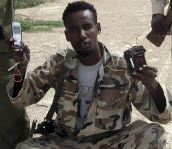 A Somalia government soldier displays components of a remotely controlled landmine with a mobile phone, which was found near a road in Bal'ad in the north of Mogadishu, Somalia, Tuesday, Dec. 18, 2007. Attackers usually detonate handmade landmines like this by remote control as government vehicles pass by, along the main roads in Mogadishu. (AP Photo/Mohamed Sheikh Nor)