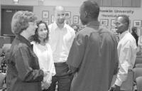 Pam Hussen, from left, with daughter Asli and son Guleid, congratulate Ohio State students Bol Awang and Jok Dau, both of Sudan, on receiving the first Nur Hussen Scholarships. Nur Hussen's co-workers established the fund to honor the man who showed others "the wonders of diversity."