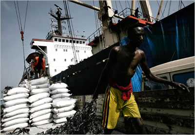 | Workers loads thousands of pounds of sugar onto a ship that will eventually make its way to the Persian Gulf. Due to its close proximity to Yemen, Djibouti's port has seen business booming as more companies are using the port to get their goods to the Gulf. |