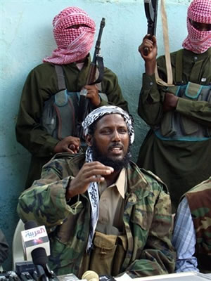 Mukhtar Robow, a spokesman for Shebab militants, is pictured during a press conference in Mogadishu in 2008 |