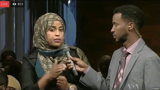 A moderator (R) and participant of VOA's Somali Service "Mogadishu-Minnesota" town hall meeting are seen in a screen grab from its Facebook stream.