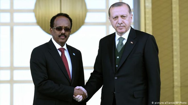 Somalia's President Mohamed Abdullahi Mohamed (left) shakes hands with Turkey's President Recep Tayyip Erdogan (right). Turkey is keen to maintain strong ties with countries in the Horn of Africa, including Somalia