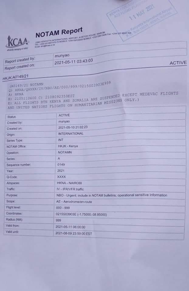 Kenya's decision to suspend flights to Somalia also comes as Somalia's Civil Aviation Authority's Monday announcement that mirraa shipments from Kenya would remain suspended despite the diplomatic breakthrough.