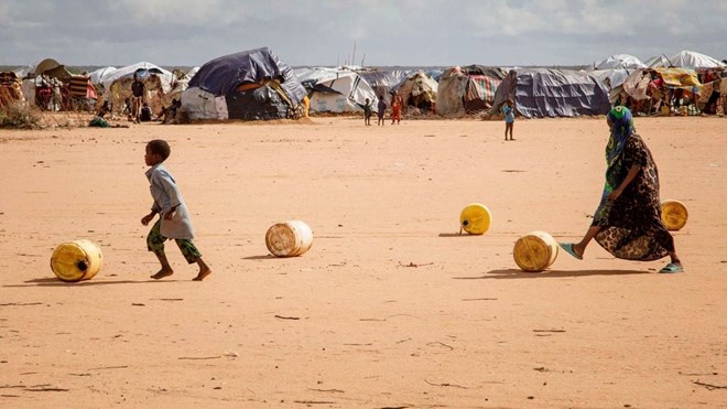 Somali refugee children roll water containers at the Dadaab camp in Kenya on March 23, 2023. UNHCR says between 400 and 500 people arrive at the Dadaab camp every day. PHOTO | BOBB MURIITHI | AFP