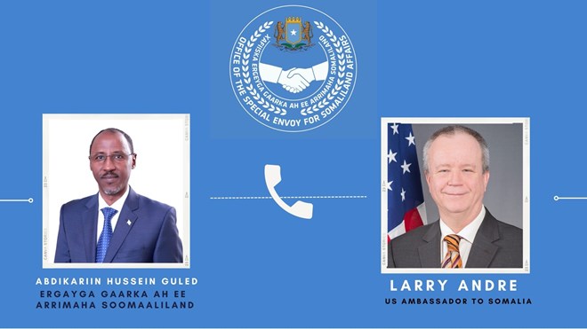 Mogadishu (HOL) - Somali President's Special Envoy on Somaliland Affairs, Abdikarim Hussein Guled, held a phone conversation on Wednesday with the departing US Ambassador to Somalia, Larry Andre, addressing the importance and urgency of initiating dialogue with Somaliland.