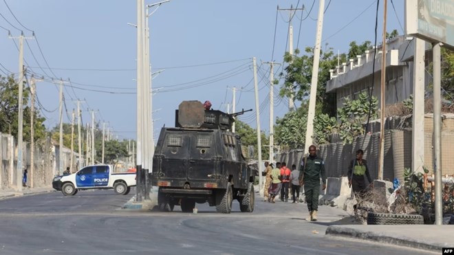 FILE - Security forces patrol outside a building that was attacked by suspected al-Shabab militants in the Somalia's capital Mogadishu on Feb. 21, 2023.