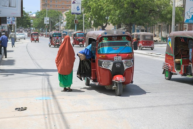 A young lady boards a TukTuk popularly known as Bajaj in Mogadishu, Somalia. Bajaj are an Indian make/ AMISOM Photo / Fardosa Hussein